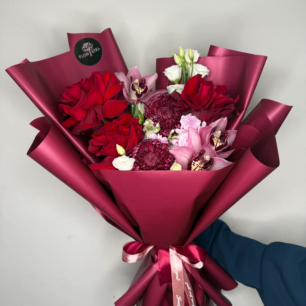 Этот роскошный букет сочетает в себе утонченную элегантность и разнообразие текстур. Французские розы — символ любви и красоты, придают композиции нежность и романтичность. Хризантема бигуди добавляет объем и яркую динамику, а нежные орхидеи вносят изысканность и экзотику. Маттиола украшает букет легкой воздушностью и свежестью. Такой букет станет идеальным подарком для особых случаев, подчеркнет ваш тонкий вкус и создаст атмосферу красоты и гармонии.