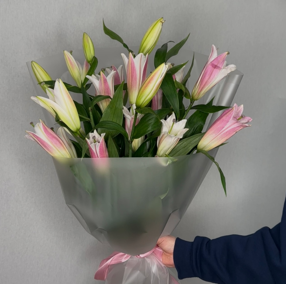 Этот элегантный букет розовых лилий — символ нежности, любви и романтики. их мягкий оттенок гармонично сочетается с изящной формой цветов, наполняя пространство атмосферой теплоты и заботы. Идеальный подарок для милых и дорогих сердцу людей, он создает ощущение особой нежности и красоты.