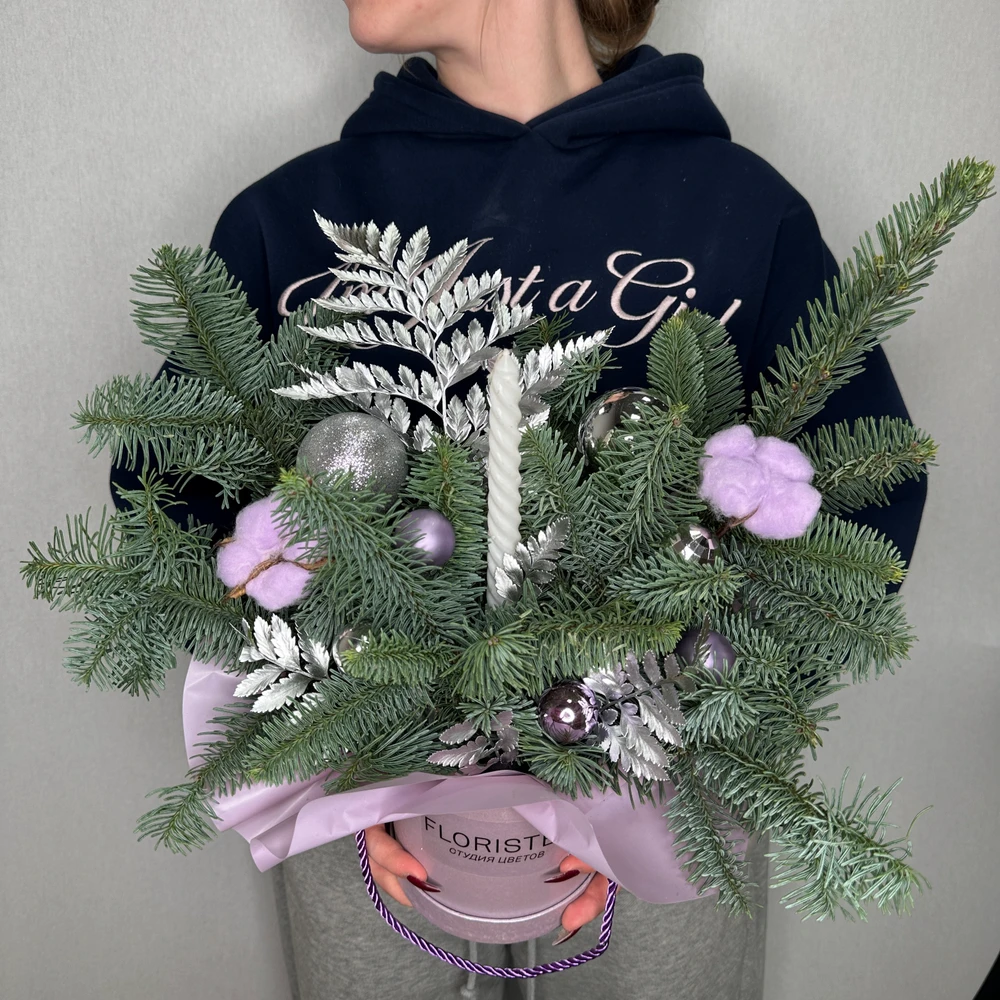 Нобилис - 1 шт. Хлопок - 2 шт. Игрушки елочные - 6 шт. Свеча - 1 шт. Папоротник - 1 шт. Коробка шляпная - 1 шт. Оазис - 1 шт.