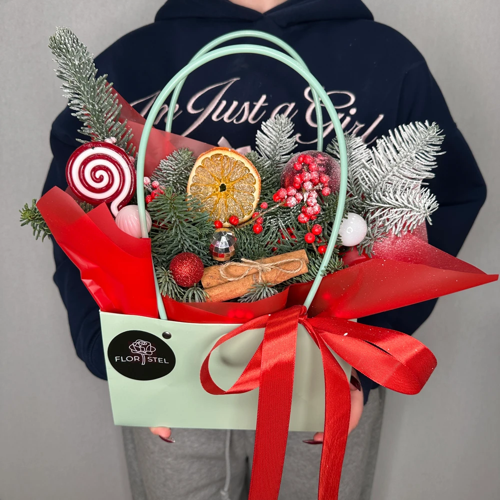 Новогодняя композиция в сумочке из нобилиса и илекса